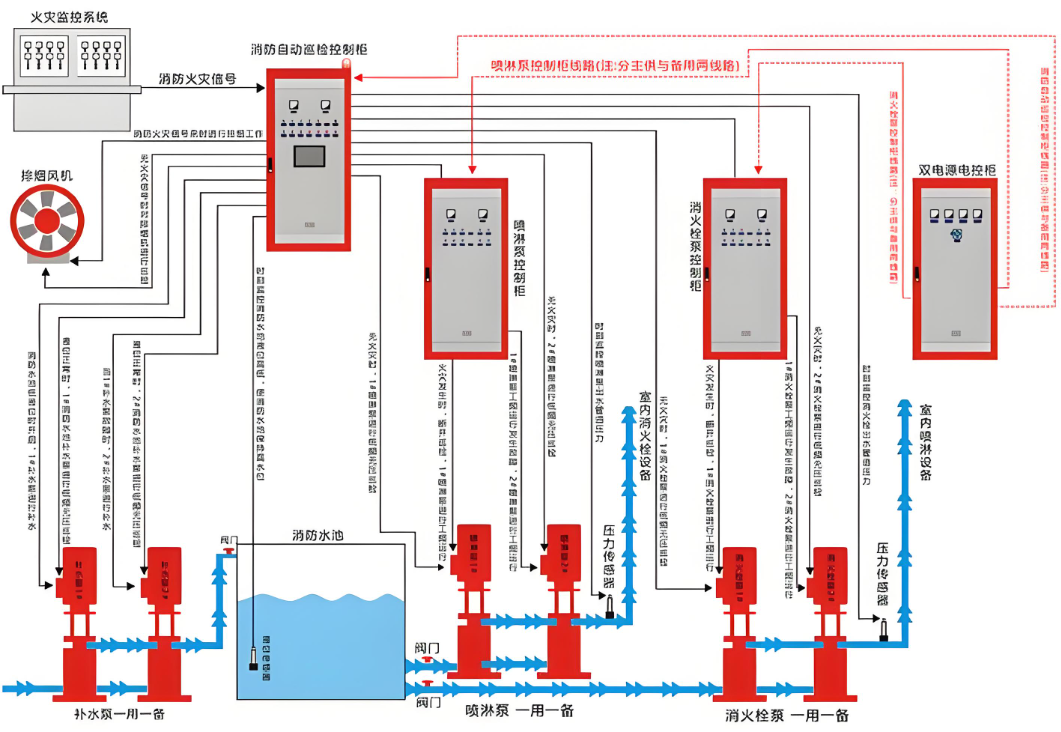 巡检时发生火灾会立即停止巡检,瞬时启动消防泵。