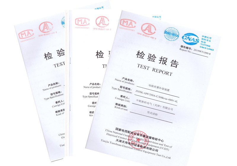 取得复合开关、有源滤波、静止无功发生器、补偿滤波模块、谐波保护器、补偿接触器、电能质量补偿装置的型式试验报告;取得低压无功功率补偿柜、低压抽出式开关柜CCC证书;