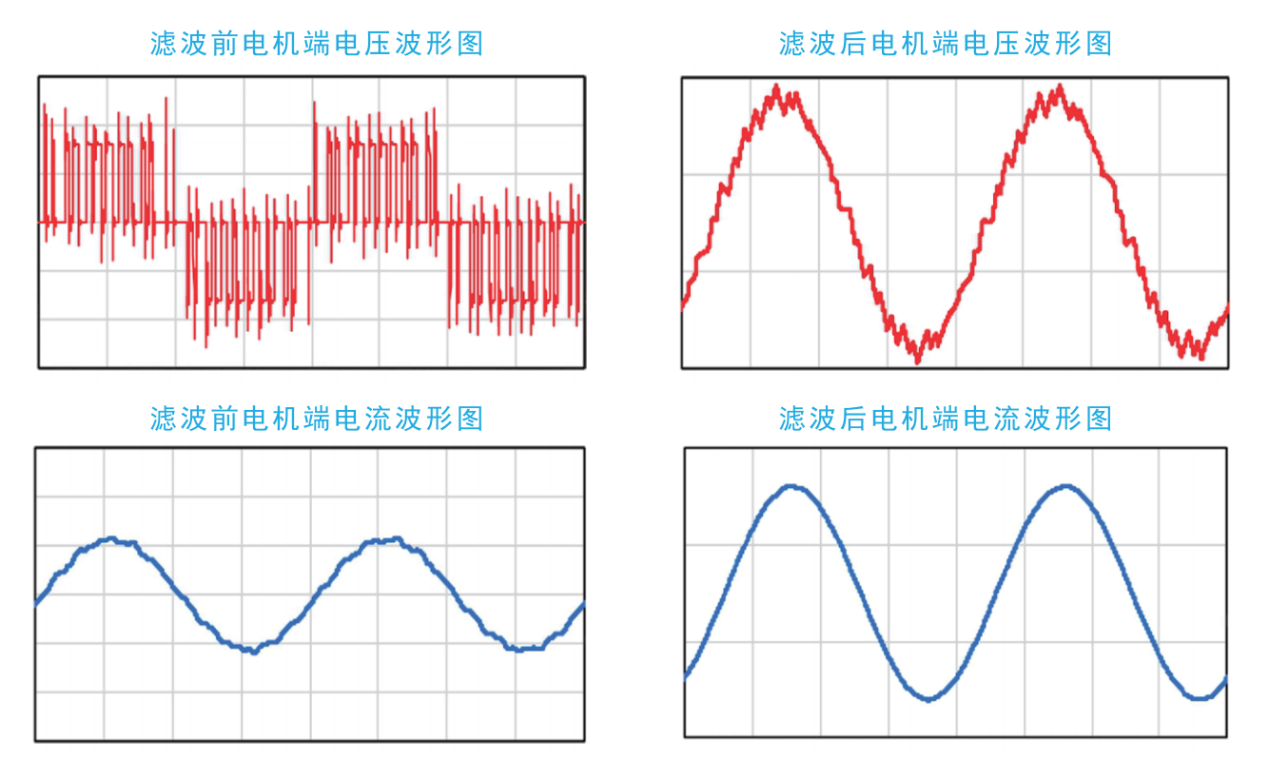将PWM波形转变为正弦波,改善电机用电质量,谐波电压畸变率含量降低至5%以下。